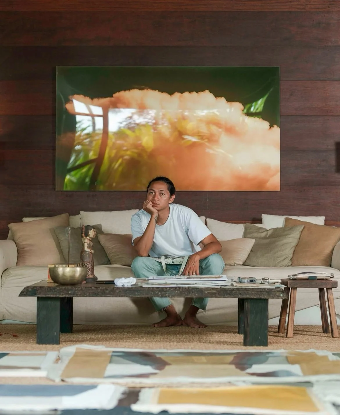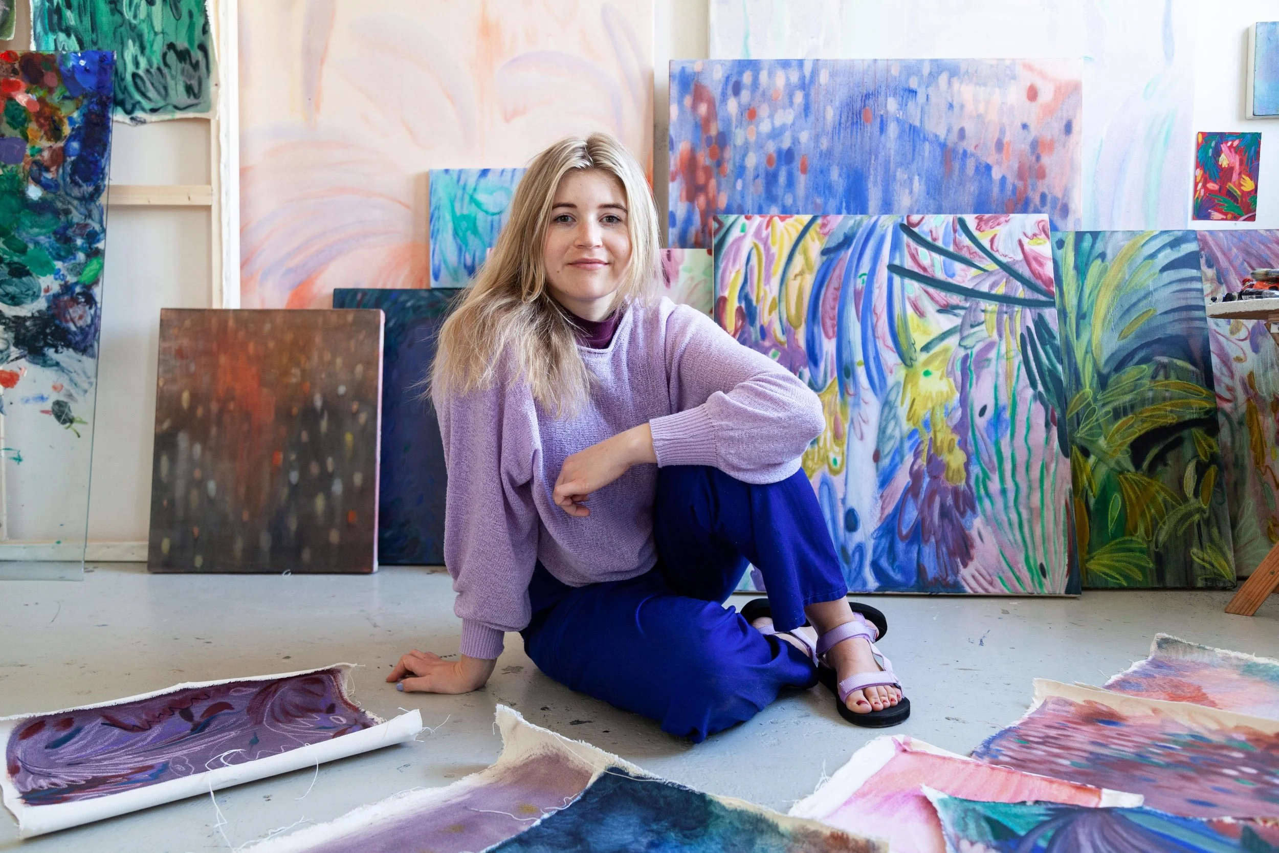 Here, pigment doesn’t rest on the surface but seeps into the canvas, much like memory over time: gentle, subtle, yet enduring.
