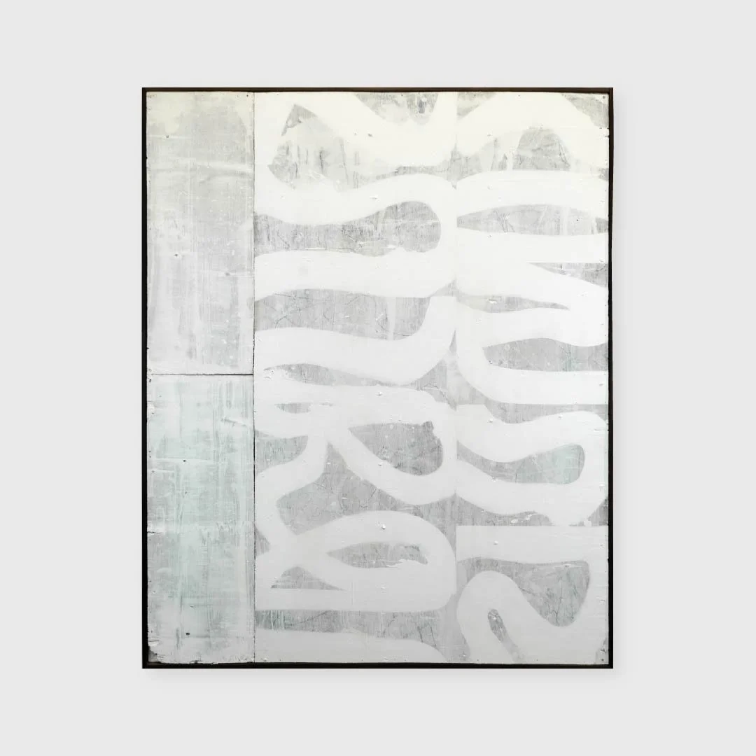 Acrylic paint, oil stick, cement on aged plywood